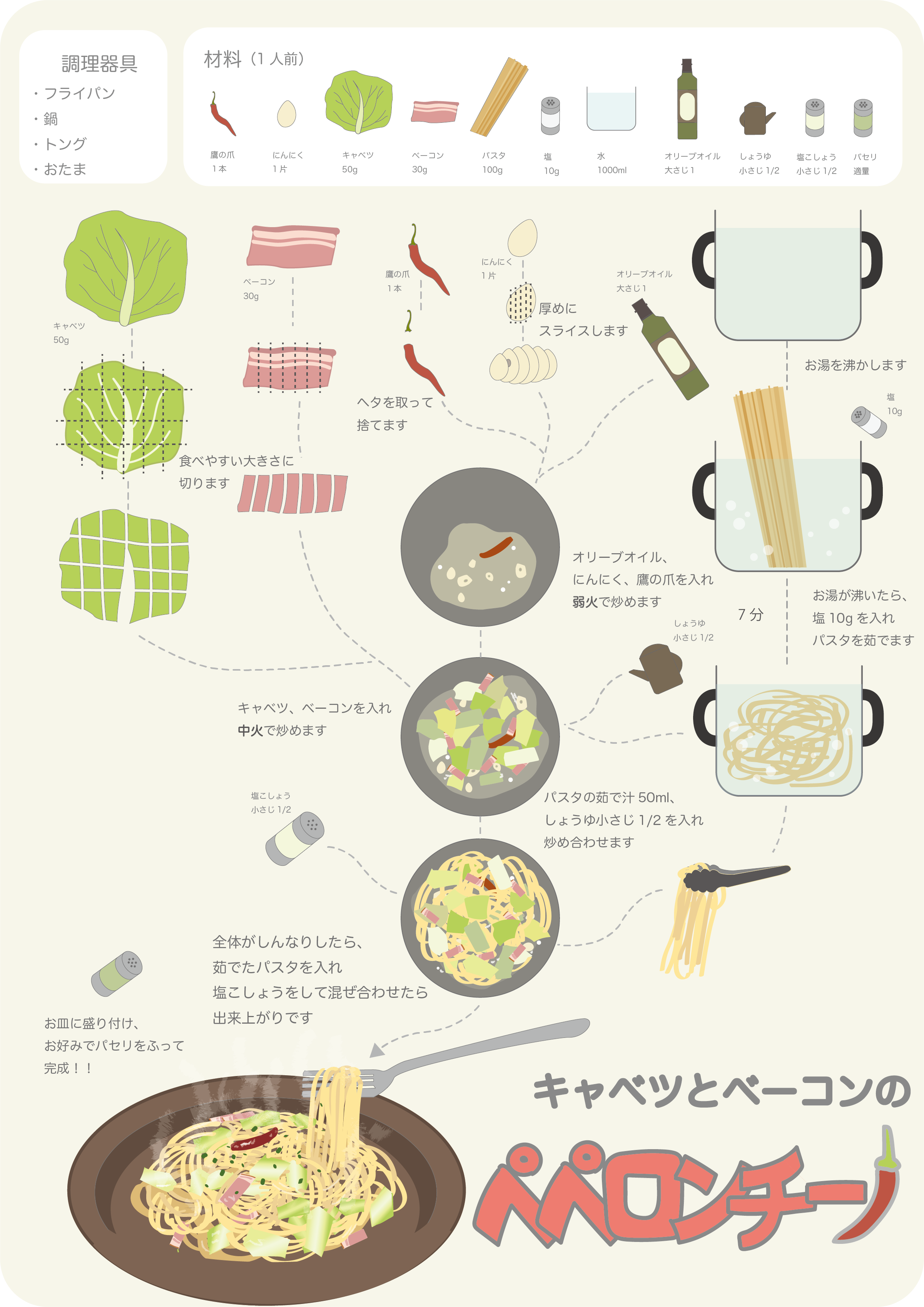 料理を作るための設計書である「レシピ」をインフォグラフィックスの手法を取り入れデザインした。料理の初心者でもすっきりと全体が見渡せて、具材の切り方や工程が平行して同時進行する部分が一目で理解できるようにした。